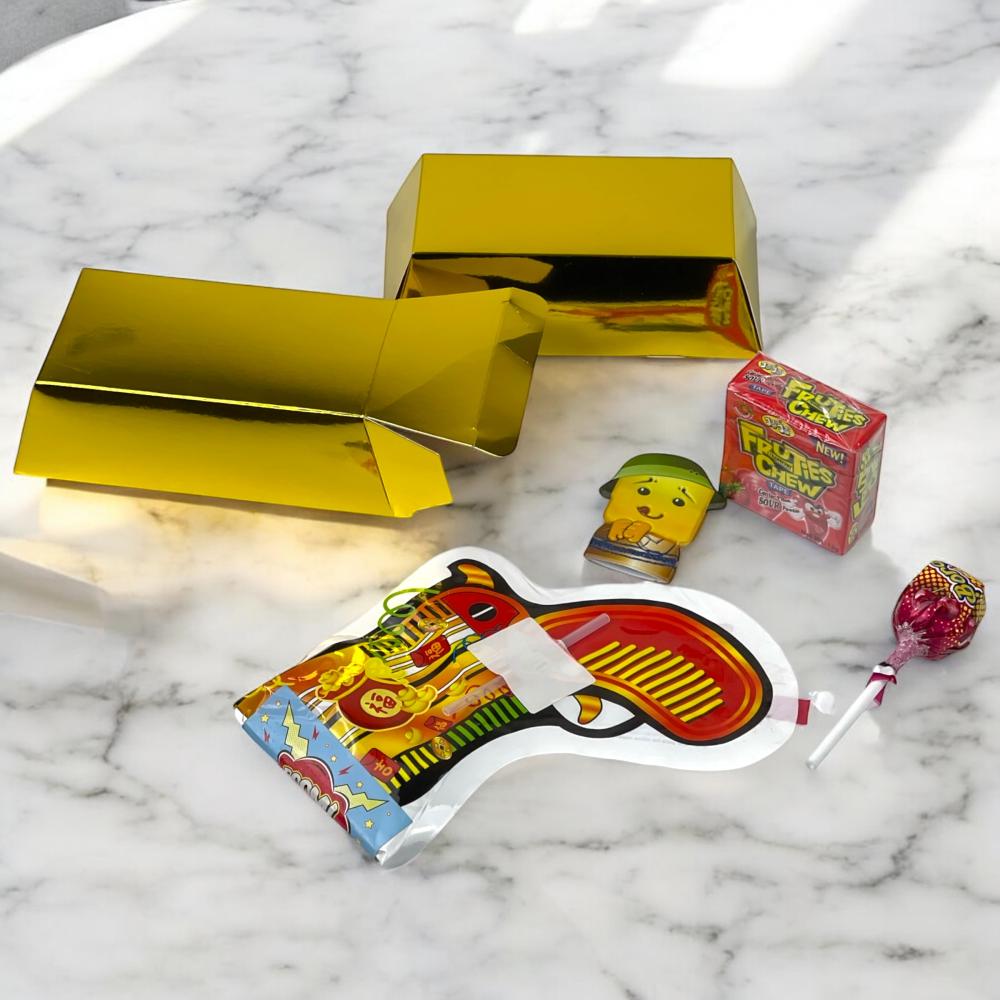 المنتج عبارة عن توزيعات عيدية للأطفال مصممة بشكل أنيق ومبهج، تأتي داخل علب مستطيلة على شكل سبيكة ذهبية لامعة تضيف لمسة فاخرة واحتفالية للمناسبة.
