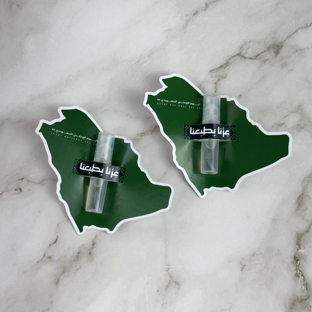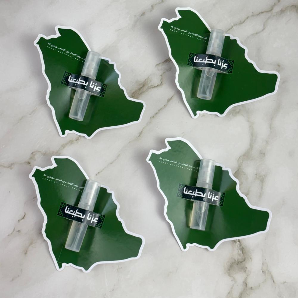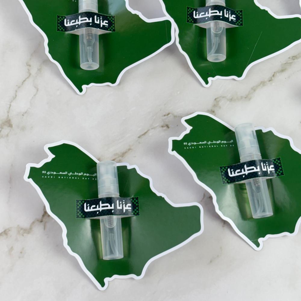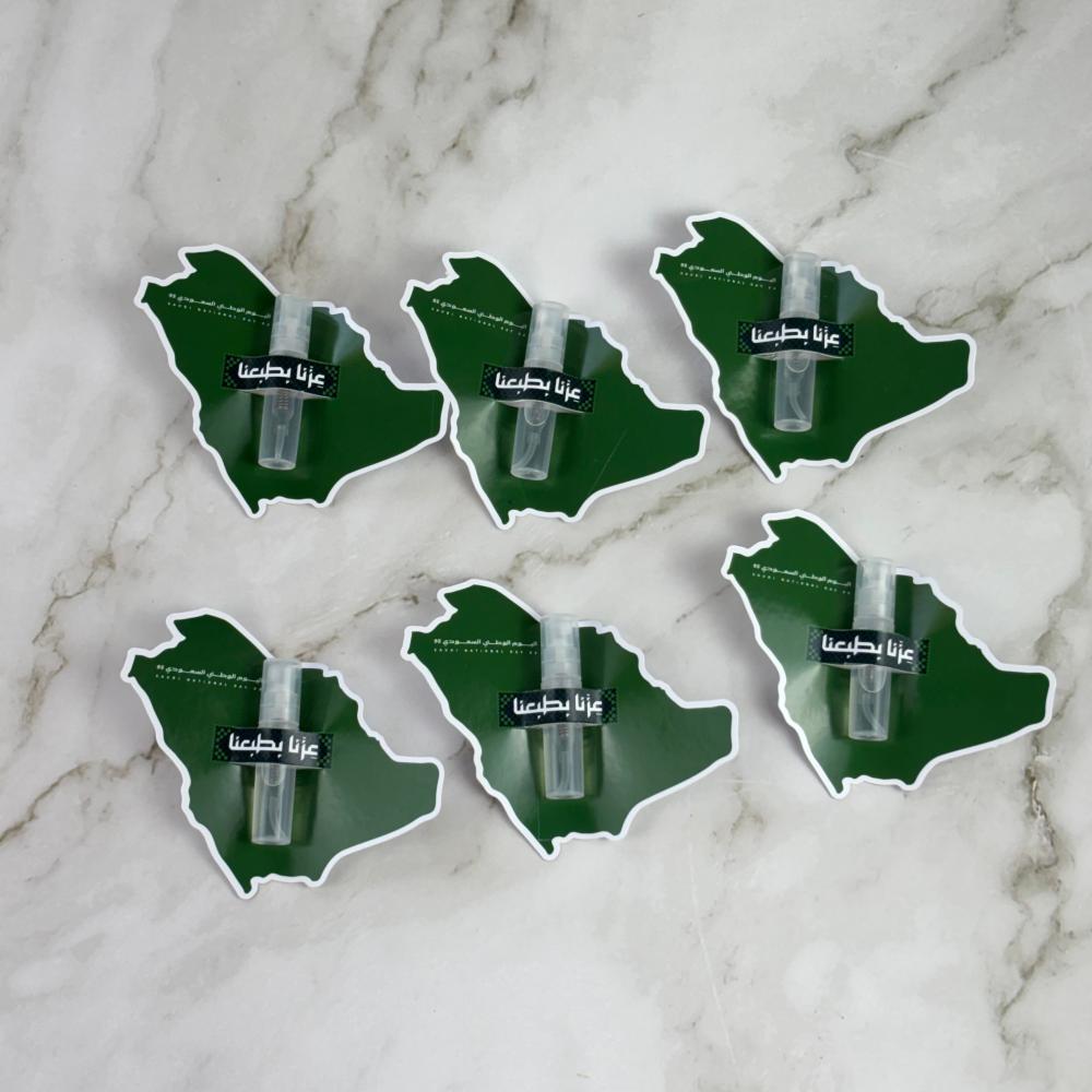 توزيعات اليوم الوطني بشكل مبتكر ومميز على شكل خريطة المملكة العربية السعودية، تحمل تولات عطر بخاخ صغيرة أنيقة.