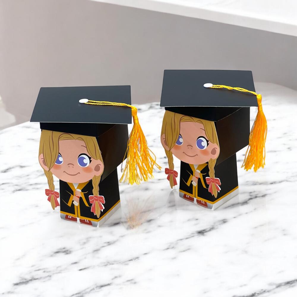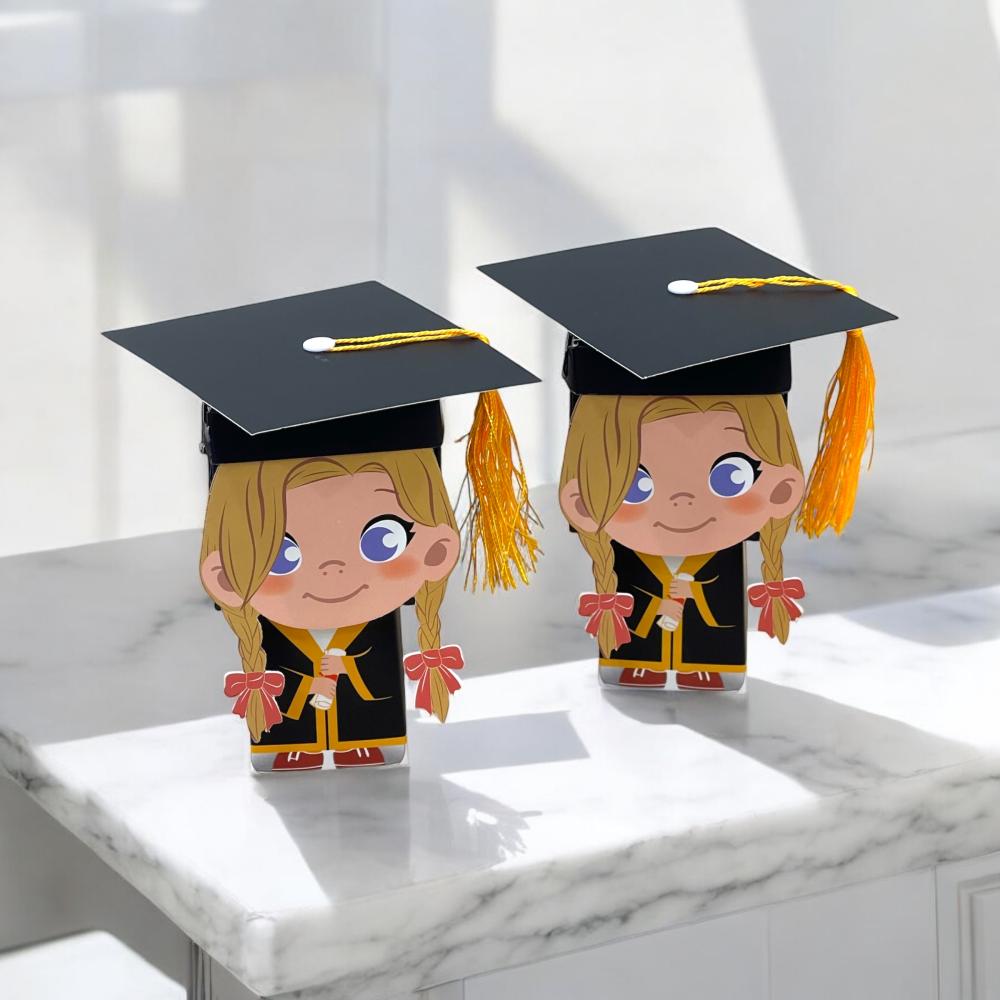 علبة توزيعة بتصميم خريجة صغيرة كرتونية بملامح لطيفة ولبس تخرج كامل، مزينة بقبعة تخرج ثلاثية الأبعاد مع شرّابة صفراء أنيقة.