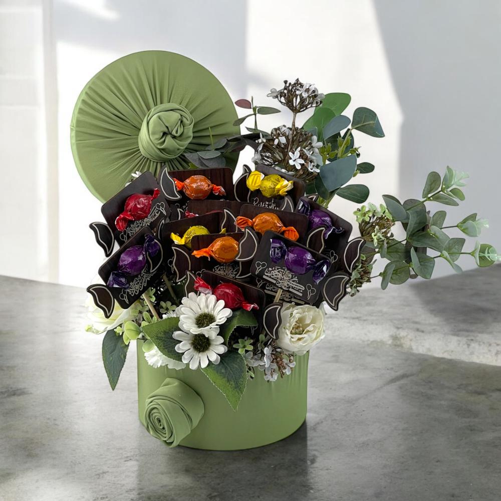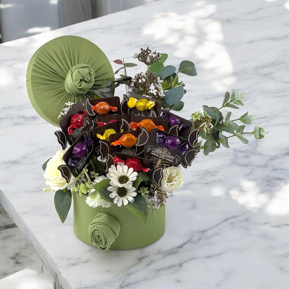 علبة دائرية أنيقة باللون الأخضر الزيتوني، مغطاة بلمسات قماشية راقية وتفاصيل ورود قماشية على الغطاء، تحتوي على تنسيق يجمع بين الذوق الرفيع والطابع الاحتفالي!