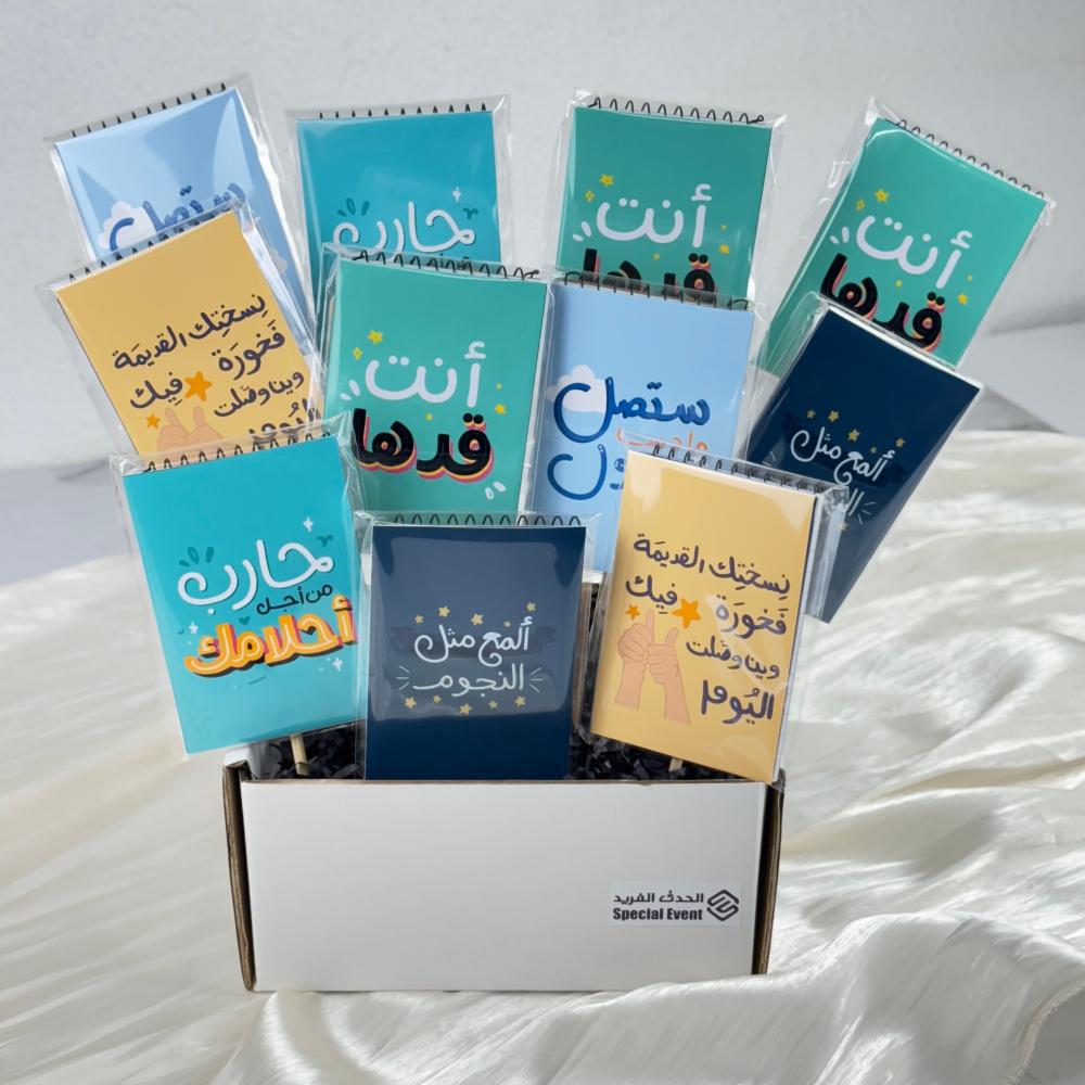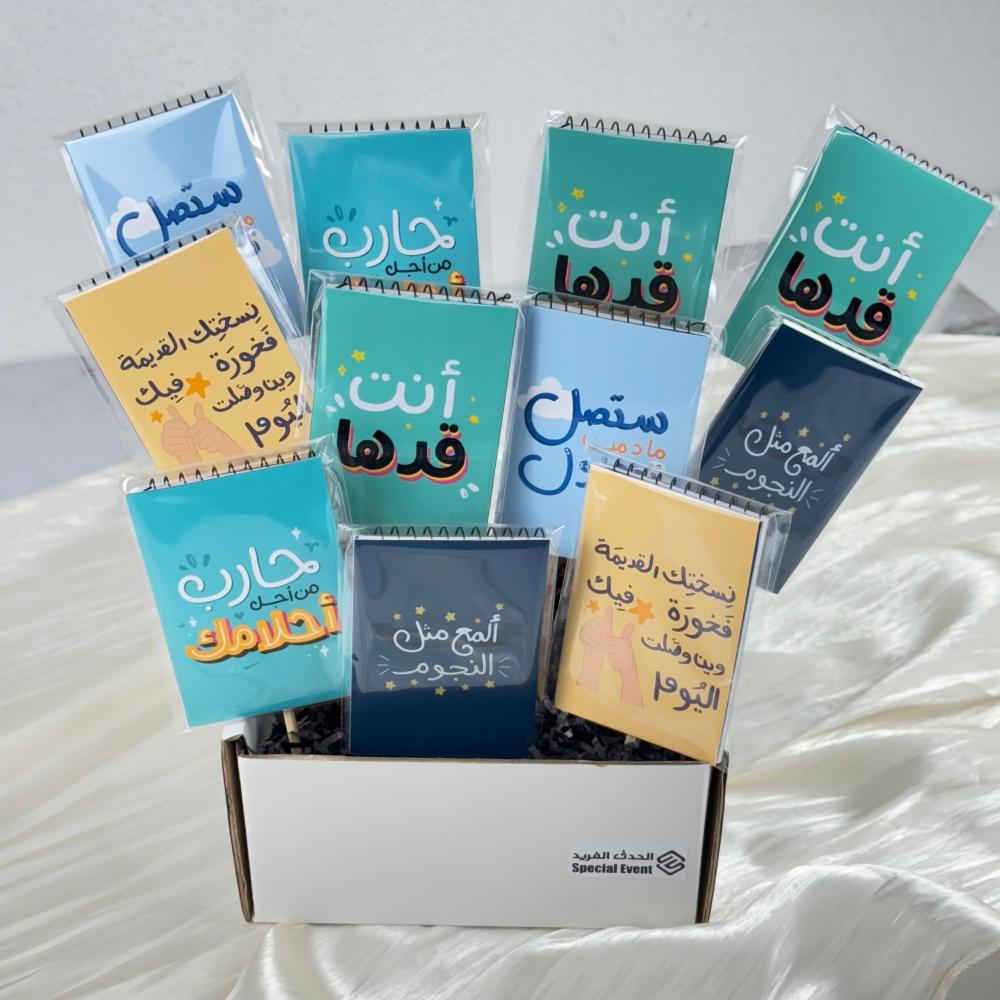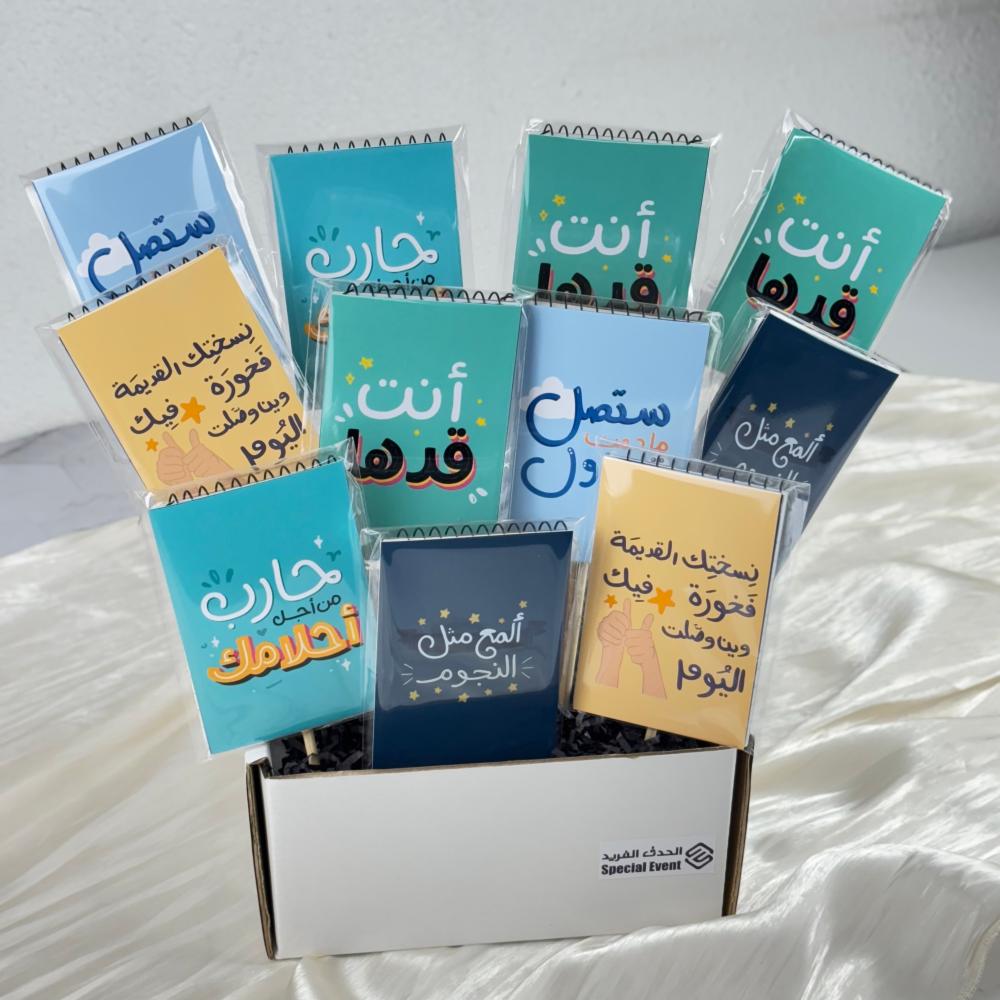 كل دفتر مرفق معه كرت تحفيزي بعبارة ملهمة مثل: أنت قدها – ألمع مثل النجوم – ستصل حتماً وغيرها من العبارات الإيجابية التي ترفع المعنويات.