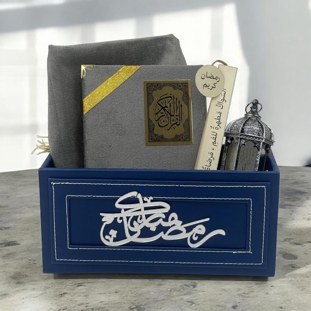 عبارة عن صندوق هدايا أنيق بتصميم فاخر ومناسب لشهر رمضان المبارك. الصندوق مصنوع من خامة جلدية بعدة ألوان الازرق الغامق والبيج