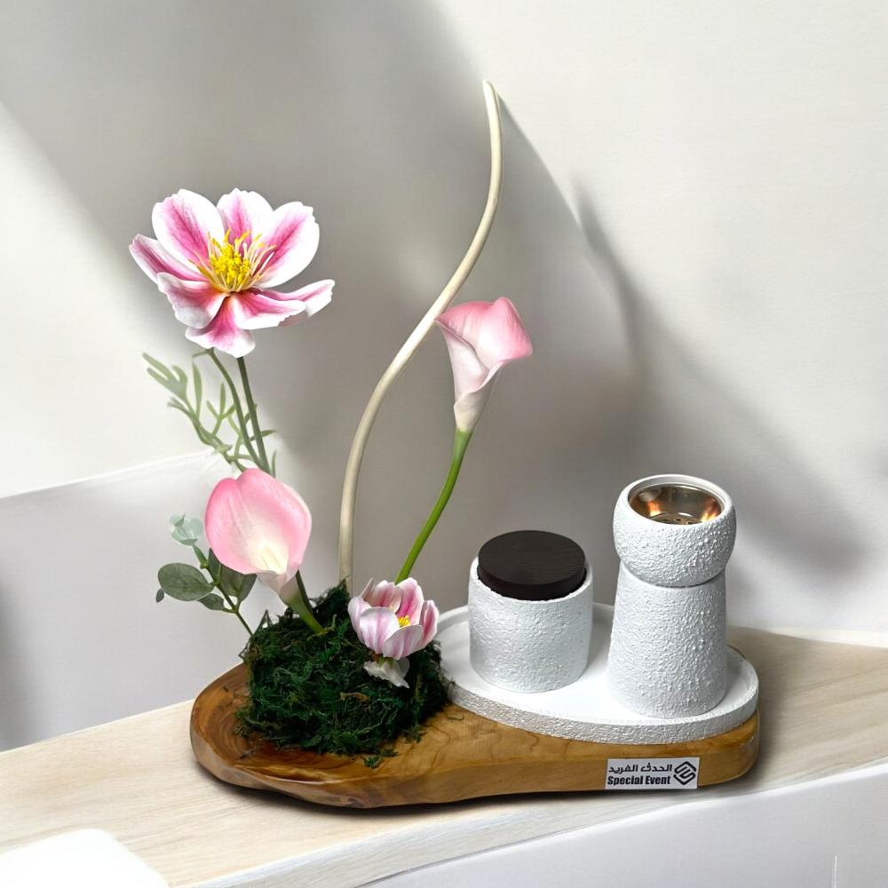 هديه أنيقه تحمل طابعًا طبيعيًا وفنيًا، تجمع بين عناصر الزهور الصناعية والفخار والخشب.